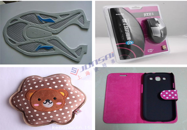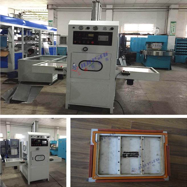 通過人工放料,高周波自動熱合壓邊切熔,定型,工作時通過人工放料,放入模具位置上,按起動開關,底部模具滑板自動滑動到固定工作位置,機頭氣缸驅動工模下降,通過預熱、高周熔接、切斷、定型,定型完畢機頭上升,底部工模滑板自動滑出,人工取出成品。在生產中可自由設置各部時間,一般為3--6秒一個作業(yè)過程。