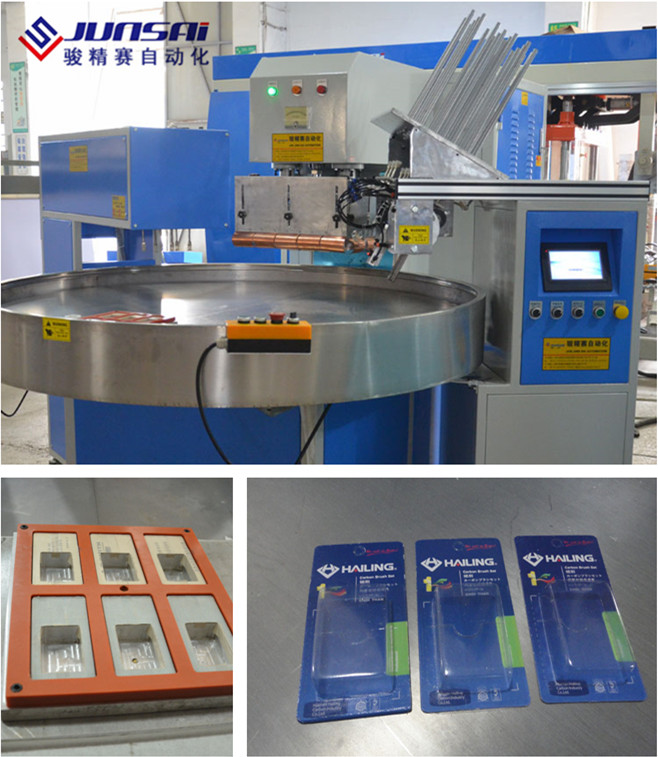 機(jī)械手六工位吸塑包裝機(jī)利用高頻熱合的原理,通過(guò)高周波模具加熱工件,到達(dá)塑料同塑料的熔接、塑膠同紙卡,或紙卡同紙卡的塑接,被熔接的紙卡通常在印刷時(shí)表面被涂上一層PVC或APET、PETG的膠水,在高周波的作用下熔為一體。